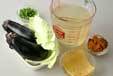 鍋にだし汁を入れて強火にかけ、煮立てばナス、キャベツ、油揚げを加え、再び煮立てば火を少し弱め、3分煮る。