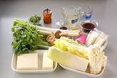 煮立てば、豆腐、白菜、シイタケ、エノキ、カマボコ、焼き白ネギ、焼き餅、カマボコを加える。