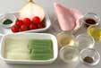 <マリネ液>に、コンニャク、ハム、玉ネギを加え混ぜ合わせ、いただく直前まで冷やしておく。