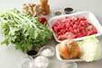 牛こま切れ肉は、大きい場合は食べやすい大きさに切り、<下味>の酒、砂糖、ウスターソースをもみ込み、片栗粉をからめる。