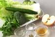 リンゴ、白菜、ブロッコリー、キュウリ、ミツバをサッと混ぜ合わせて器に盛り、よく混ぜ合わせた<ドレッシング>をかける。