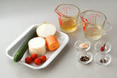 熱いうちに<つけ汁>につけ、キュウリを加える。粗熱がとれれば冷蔵庫で保存する。食べる前に器に盛り、プチトマトを添える。少し冷えれば食べられます。