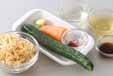 キュウリは両端を切り落として斜め薄切りにし、更に細切りにする。
