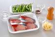 器にブリを盛り、シシトウ、甘酢ショウガを添える。