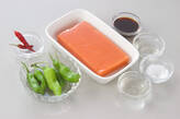 板コンニャクは手でひと口大にちぎる。シシトウは軸を切り落とし、斜め半分に切る。赤唐辛子は、軸を切り落として2~3つに割り、種を取る。