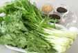 青菜は根元を切り落として水洗いし、3cmの長さに切る。熱湯でサッとゆでて水に取り、粗熱が取れれば水気を軽く絞る。青菜は冷蔵庫に残っている野菜を使えばOK。ここでは、菊菜1/2束・水菜2/3束を使っています。