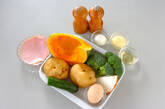 カボチャとジャガイモは鍋に戻し、中火にかけて鍋を揺すりながら水分を飛ばす。ブロッコリーはザルに上げ冷ましておく。卵は水に取りホイルをはずして、粗熱が取れたら殻をむく。