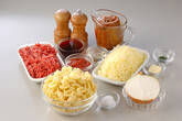 <ミートソース>を作る。玉ネギはみじん切りにして、フライパンにサラダ油を中火で熱し、玉ネギが少し透き通るまで炒め、牛ひき肉を加え炒め合わせる。塩コショウ、ケチャップを加え全体になじめば、赤ワイン、デミグラスソースを加え、2~3分煮て火を止める。