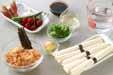 器に氷と素麺を盛り、オクラ、アメリカンチェリーをのせ、薬味、つけダレを添える。