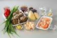 ホタテ貝柱は斜め半分に切り、むきエビは背ワタを楊枝などで取り、各々塩水で洗い水気を切る。