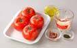 トマトは水洗いし、ヘタ側上から2cm位の所を横に切る。スプーンで中をつっ突いて水分を切り、少しカサを減らす。トマトの安定が悪い場合は底を少し切る。