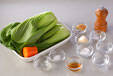 たっぷりの熱湯を沸かし、酒、塩を加え、チンゲンサイとニンジンをサッとゆで、ザルに上げる。