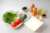 ○豆腐はサッと水洗いし、大きめの一口大に切る。○トマトはヘタをくり抜き、1cm角に切る。○干し芽ひじきは水で柔らかく戻し、ザルに上げて流水で洗い、水気をきる。○キュウリは芽ひじき位のせん切りにする。