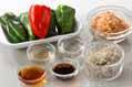 ピーマン、赤ピーマンは縦半分に切ってヘタと種を取り、横に細切りにする。