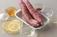 サツマイモは皮ごときれいに水洗いし、1.5cm厚みの輪切りにして水に放つ。(細い場合は皮ごときれいに水洗いし、食べやすい長さの輪切りにして水に放つ)