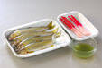 ・おどり串の打ち方手前から見て、頭を下にして左側を腹にして、口から長めの金串又は竹串を差し入れ、胸ビレより少し尾側で中骨より腹側から串を出す。串を出した3~4cm先から縫うよう(中骨より背側)に串を差し入れ、裏側(盛り付けたときに表になる側)に串が出ないように串を通し、最後に尾の手前に(中骨より下から)串を出す。 |