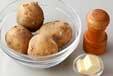 ジャガイモは皮ごときれいに水洗いし、1個ずつラップに包んで電子レンジで6~7分加熱する。竹串を刺してみてスッと刺さればOK、堅ければもう少し加熱して下さい。