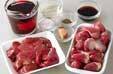 鶏レバーは残っている血を流水できれいに洗う。砂肝は白いかたい部分を削ぎ落とし、食べやすい大きさに切る。鶏ハツは斜め半分に切る。
