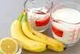 バナナは皮をむいて1cm位の輪切りにし、レモン汁をかけて冷凍する。