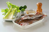 器にアイナメとセロリを盛り合わせ、<合わせ甘酢>を掛ける。