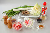 ボウルに豚ひき肉、エビ、キャベツ、ニラ、白ネギ、<合わせ調味料>の材料をよく混ぜ合わせる。