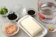 鍋に<スープ>の材料を入れて強火にかけ、煮立てばツナ缶を汁ごと、豆腐を加える。