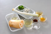 白ネギは4~5cmの長さに切り、縦に切り込みを入れ1枚に開いて縦細切りにし、水に放ち軽く水に中でもみ洗いし水気を絞る。(白髪ネギ)