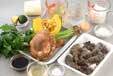 松茸は石づきを鉛筆を削るように少し削ぎ落とし、ぬれ布巾で汚れを拭き取る。軸と笠に切り分け、更に各々4等分に切る。