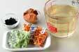 干しワカメは水で柔らかく戻して水気を絞り、長い場合はザク切りにする。