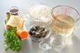 アサリは塩水で殻と殻を軽くこすりあわせて洗い、水気を切って鍋に入れ、酒を加え蓋をして強火にかける。アサリの口が開いたら火を止め、アサリを取り出して身を殻から外す。蒸し汁は水で濡らして絞ったキッチンペーパーでこす。