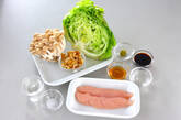 フライパンにゴマ油を入れシメジ、ささ身を入れて、ささ身が白っぽくなるまで炒める。