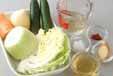 キャベツ、キュウリ、ニンジン、大根を合わせ、塩を加えて軽くもみ、しんなりすれば水気をしっかり絞る。