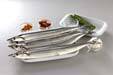 サンマは尾から頭に向かって、包丁の背でぬめりをこそげ取り、きれいに水洗いし水気を拭き取る。半分の長さに切り、斜め格子に切り込みを入れる。