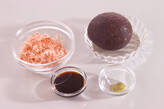 アボカドは果肉を取り出し、食べやすい大きさに崩す。かつお節、<合わせじょうゆ>と混ぜ合わせ、器に盛る。