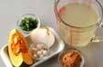 鍋にだし汁、カボチャを入れて中火にかけ、煮立てば玉ネギを加え5~6分煮る。