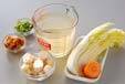 鍋にだし汁を入れて中火にかけ、煮立てば白菜、ニンジンを入れ、しんなりすれば麩を加える。