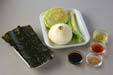 器に合わせた新玉ネギを盛り付けて焼きのりを散らし、白ゴマを振り掛ける。<ドレッシング>を掛けていただく。