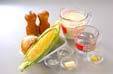 鍋にバター、サラダ油を中火で熱し、生トウモロコシ、玉ネギを炒め、しんなりしたら<スープ>を加える。