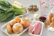 豚肉は<下味>をからめておく。玉ネギは縦半分に切り、縦幅5mmに切る。ジャガイモは皮をむいて6〜8つに切り、水(分量外)に放つ。ニンジンは皮をむき、ひとくち大の乱切りにする。ホウレン草は水洗いしてサッと熱湯(分量外)に通し、水(分量外)に取って粗熱が取れたら水気を絞り、根元を切り落として幅1cmに切る。リンゴは皮をむいて芯を取り、すりおろす。