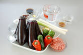 肉の色が変われば、水気を切ったナスを炒め合わせ、合わせておいた<調味料>を加える。