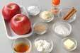 耐熱容器に芯をくり抜いたリンゴを並べ、中央に<クラム>をのせ、180℃に熱したオーブンに入れ焼く。