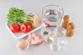 鍋にサラダ油を中火で熱してベーコンを炒め、香りが立ってくれば<スープ>を加える。