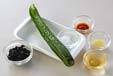 キュウリは縦縞目に皮をむき、薄い輪切りにし、塩少々でもむ。しんなりしたら水洗いして水気を絞っておく。
