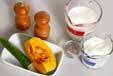 カボチャは種とワタを取り、皮を削ぎ落とし一口大に切って水に放つ。ぬれたままラップで包み、電子レンジで3~4分加熱する。竹串がス~ッと刺さればOK。