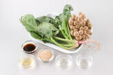 続けてシメジをサッとゆで、ザルに上げて冷まし、ほうれん草と共に<和えダレ>で混ぜ合わせ、器に盛る。