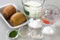 <キウイソース>のキウイは皮をむいて1cm角に刻み、他の材料と共にホウロウの小鍋に入れ、トロミがつくまで煮て粗熱が取れれば冷蔵庫で冷やす。