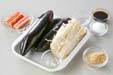 ナスはヘタを切り落として縦半分に切り、5mm幅の半月切りにし水に放つ。