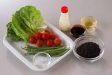 器にサラダ菜を敷き、1を盛り付け、プチトマト、サヤインゲンを散らし、マヨネーズをかける。