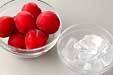 涼しそうなボウルに氷水を入れ、スモモを盛り付ける。そのままテーブルに置き、取り皿にとっていただきます。