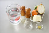 <調味料>の材料を加え、塩コショウで味を調えて器に注ぐ。
